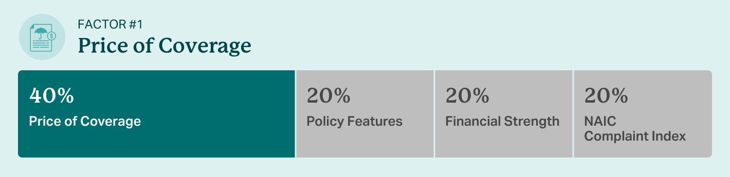 We measure the price of a company’s most popular they promote relative to its competitors. The closeness of their cost to other companies determines the final score. Read a full breakdown of the price of coverage factor on our review methodology page.
