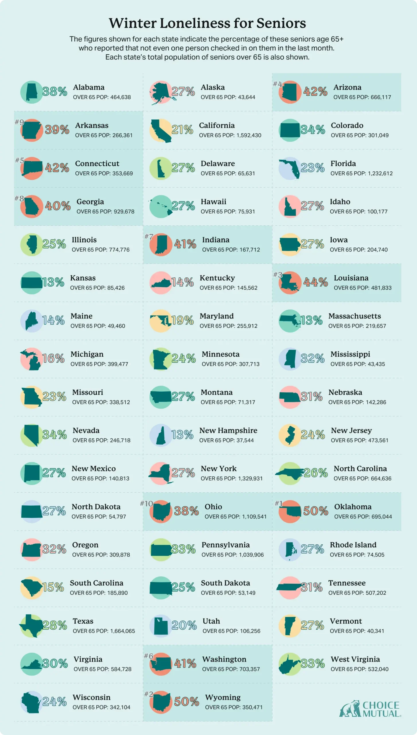 The New England-to-Mid-Atlantic corridor has a cluster of low-loneliness states: New Hampshire (13%), Massachusetts (13%), and Maryland (19%) sit well below the national average of 27%.