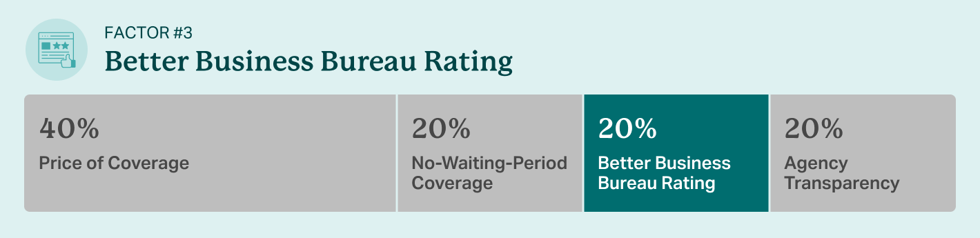 The Better Business Bureau assigns a letter ranking (A-F) to each business, representing its level of trustworthiness. Our scores are based on the company’s ranking with the BBB. Read a full breakdown of the BBB rating factor on our review methodology page.